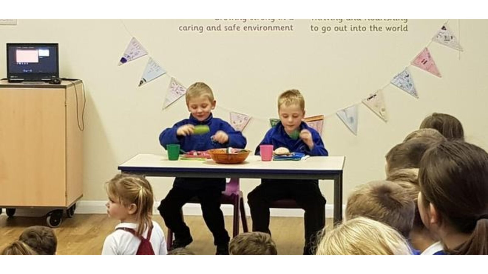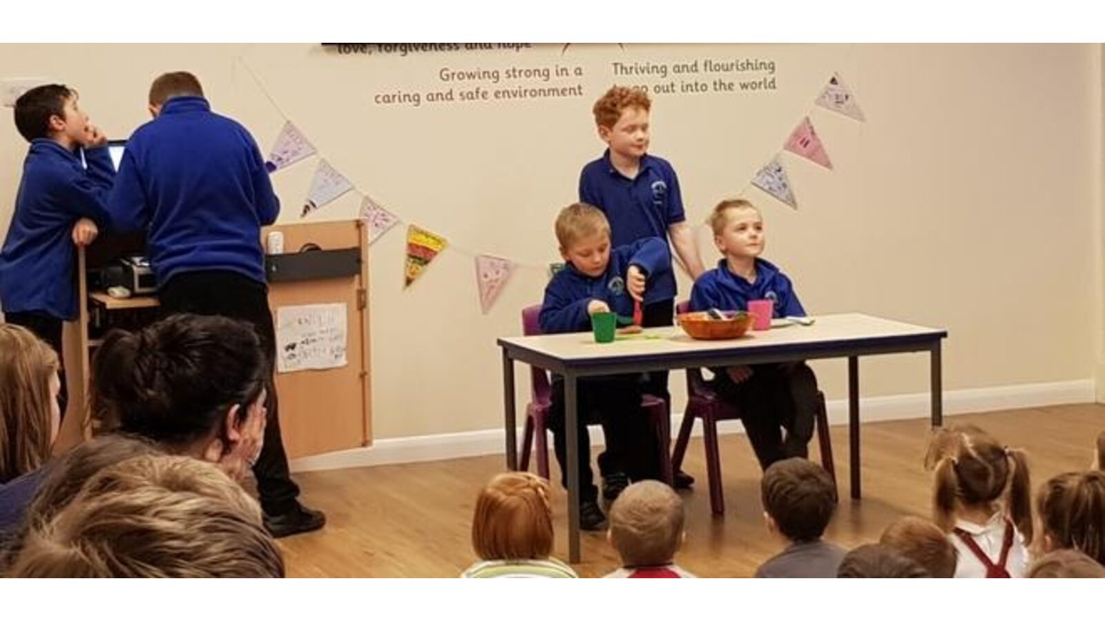 7.11.19 Standing up in front of the whole school to deliver Collective Worship can be quite daunting , even when they are your friends. We were treated today on an informative worship about Healthy Food. These two year 2 pupils were supported by a year 5 pupil who has given up his play times this week to advise, encourage and practise. The result being two little boys who managed to deliver a confident and enjoyable assembly.